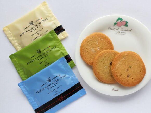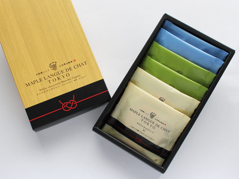 3種類のチョコレート(抹茶チョコレート、ホワイトチョコレート、ヨーグルトチョコレート)を、メープルシュガーの風味が漂うラングドシャではさんでいます。