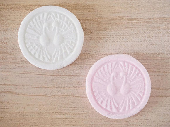 お菓子は直径4.5cmほど。なお、色は違うものの、味は紅白どちらも同じです。