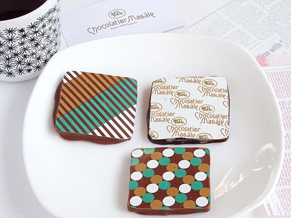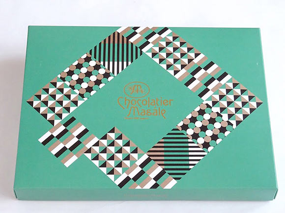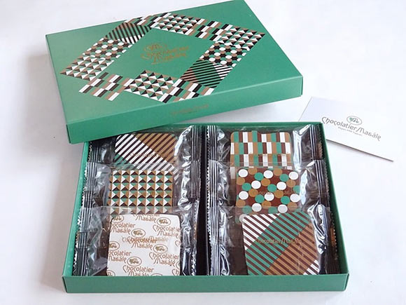 ミントグリーンを基調としたオシャレなデザインの箱を開けると、見た目にも美しいプリント柄のチョコレートが並んでいました。