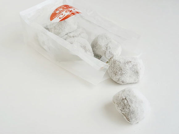 黒砂糖入りの小麦粉の生地でこしあんを包んで焼き、真っ白な粉をまぶした、楕円形のお菓子です。