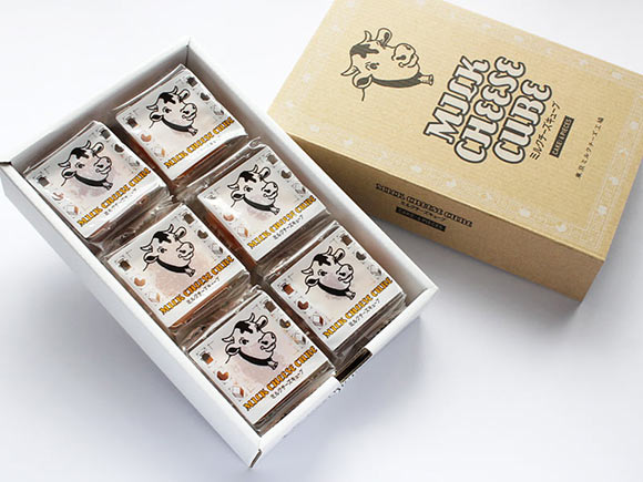 「ミルクチーズキューブ」のダンボールでできたパッケージが特徴的です。