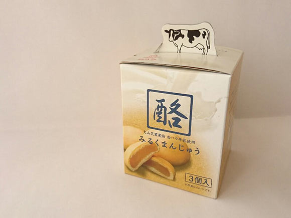 牛がちょこんと飛び出たかわいらしいパッケージ。こちらは、鳥取県の大山で採れた牛乳を使ったおまんじゅうです。
