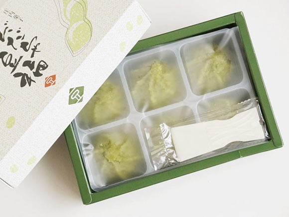 茶巾のようなかたちのひと口サイズで、ヘラが付属しているため手を汚さずに食べられるのもうれしいポイント。