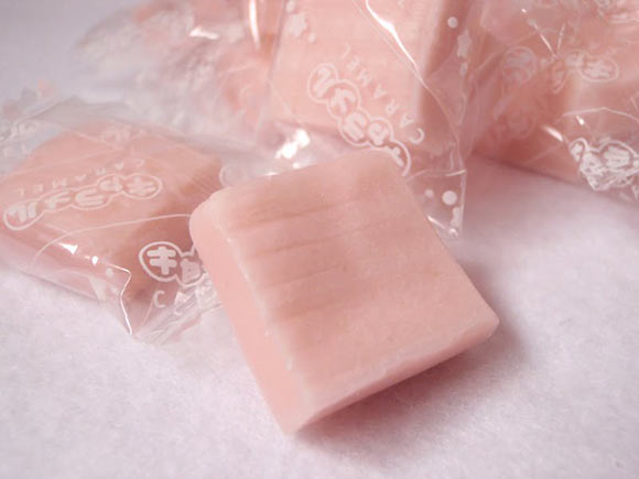 きれいな淡いピンク色をしたいちご風味のキャラメルです。