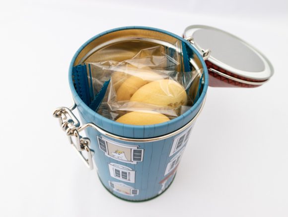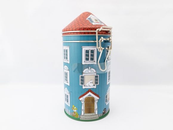ムーミン屋敷をかたどったキャニスター缶の中にクッキーが入っていますよ。