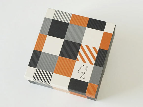 お菓子はプラスチックのケースに詰められ、オレンジとグレーのチェック柄の箱に入っています。