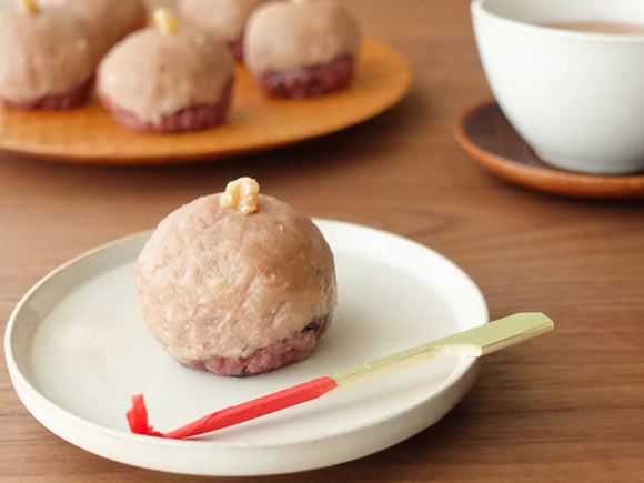 まあるいフォルムのおはぎに、ちょこんと乗せられたくるみ。
