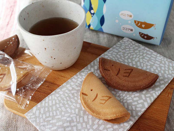 直径8㎝ほどの丸い洋風せんべい。中央で曲げられ半月形になっています。目とひれは焼き印で付けられ、焼き印の位置によって表情が少しづつ違うのが見ていて楽しいです。どんな味なのでしょうか。