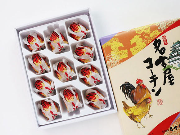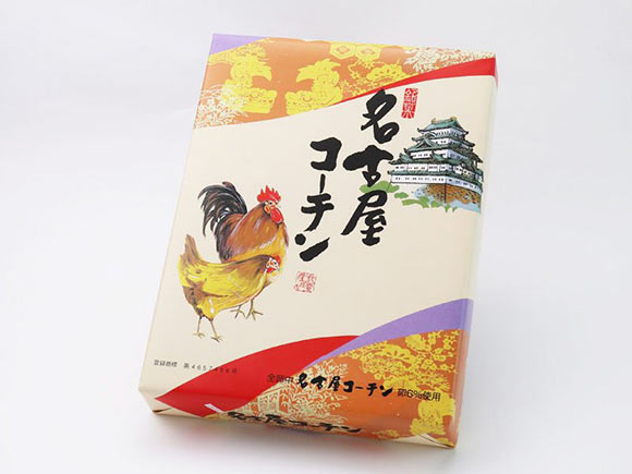 名古屋土産と一目で分かるパッケージ。名古屋城と名古屋コーチンがデザインされています。