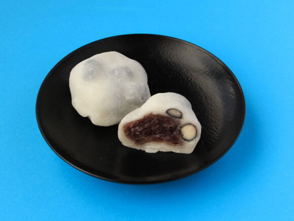 黒豆をまぜたつきたてのお餅に、粒あんが包まれています。