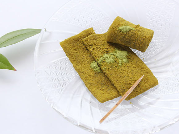 深い緑色をした板状のわらび餅は、とろけるようでなめらか。そしてモチモチの食感なんです。