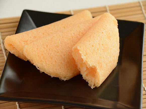 菓子名のとおりかるかんをアレンジしてあり、半月のかたちのかるかんに小みかんのあんが入っています。