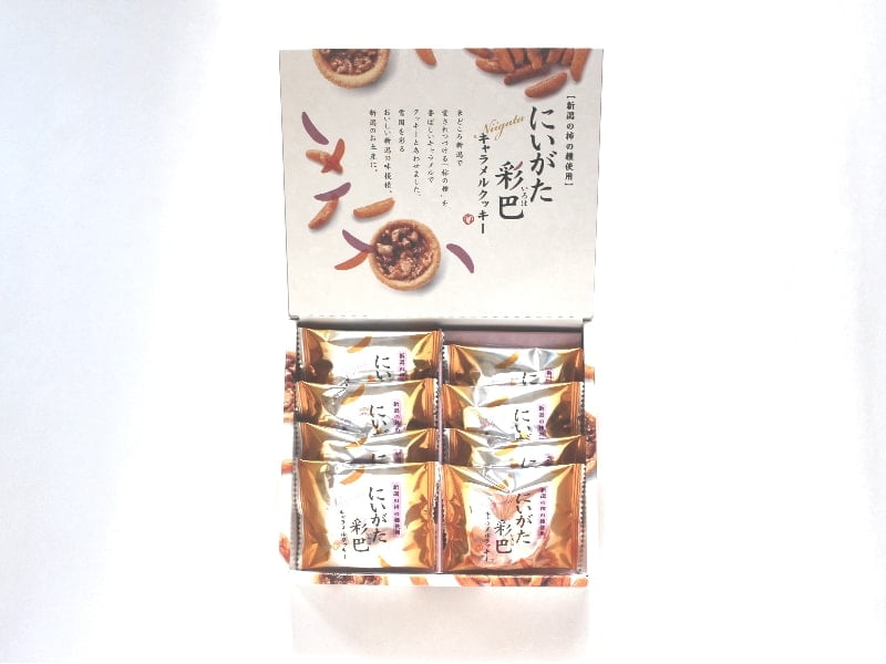 にいがた彩巴キャラメルクッキーは新潟県内限定のおみやげ。新潟といえば柿の種が有名ですが、その柿の種と香ばしいキャラメル、そしてクッキーをかけ合わせた新しい触感のお菓子です。