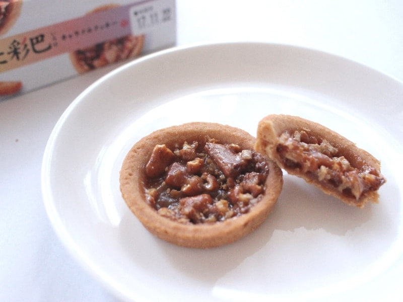 さて個包装を開けてみると、クッキーの甘い香りが漂ってきます。土台となるクッキー生地の中に、細かく砕かれた柿の種とキャラメルが詰まっていて、スイーツ好きの人なら食欲をそそられること間違いなし。