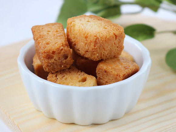 きれいなうすピンク色のラスクは約2~3cm角ほどの大きさで、コロンとした可愛らしい見た目です。