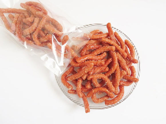 中のかりんとうは、サーモンピンクのような自然な色。