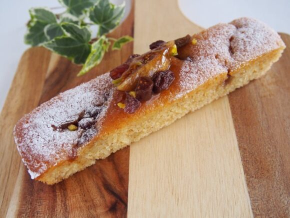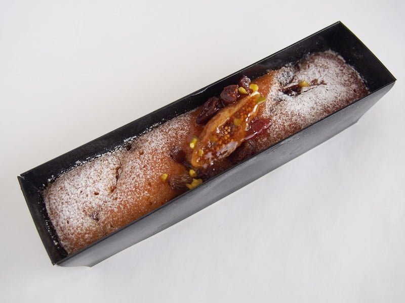 ドライフルーツと粉砂糖がまぶされているケーキはとてもオシャレな見た目。