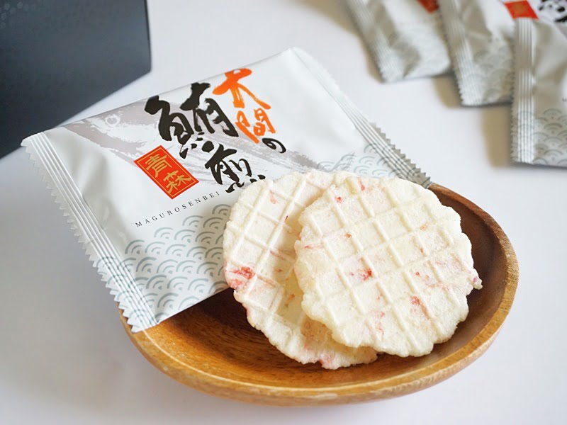 大間の鮪煎餅は、青森県大間産のマグロを生地に練り込んだ、わさび風味のせんべい。