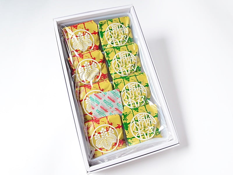 赤と緑の包みがありますが、中身は同じで、白こし餡に黄身を加えた黄身餡がたっぷりと入っています。