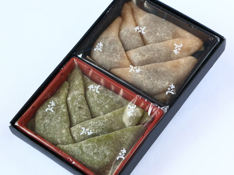 このにっきと抹茶の詰め合わせは、その名のとおり、にっきの生八つ橋であんを包んだおたべと、抹茶の生八つ橋であんを包んだおたべのセットです。どちらも粒あんを使っており、生八つ橋とあんの食感の違いも楽しめますよ。