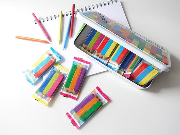 缶ケースは懐かしいクーピーと同じ柄でとてもカラフル。