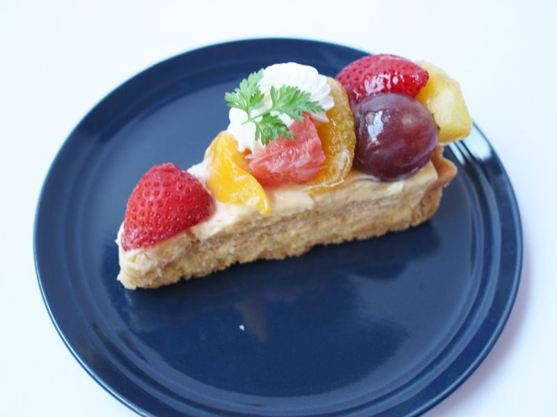 その上にはカスタードクリーム、生クリーム、フルーツがトッピングされていて、一緒に食べるとクリームの甘みとフルーツの酸味がバランスよく組み合わさり、ちょうどいい甘さに。
