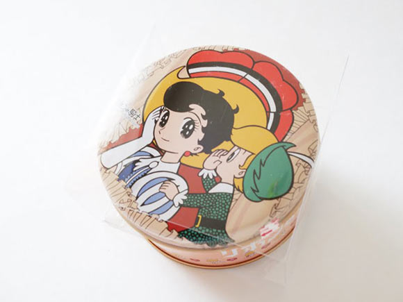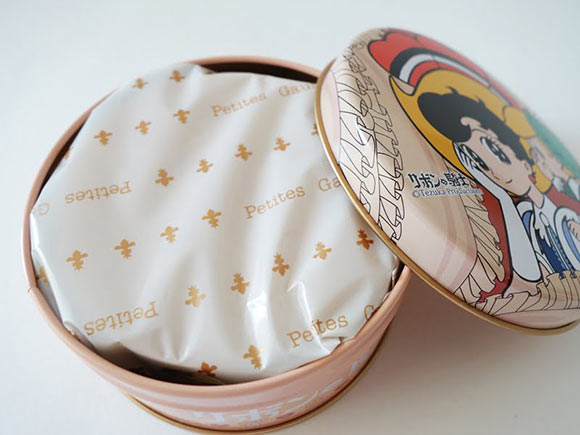 リボンの騎士のイラストが描かれた、缶入りのゴーフルです。