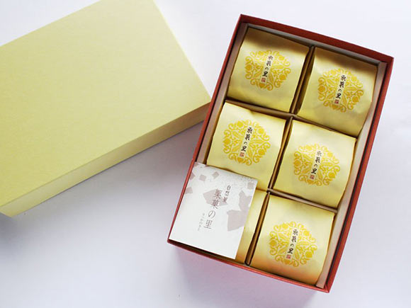 栗をイメージする黄色の箱を開けると、中から同じく黄色の袋に包まれた栗菓の里が現れました。
