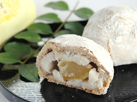 寛永7年(1630年)創業の千鳥屋宗家が手がける、栗をまるごと1粒包み込んだお菓子です。甘く煮た栗を白餡で包み、さらに外側をはったい粉の生地で包んで焼き上げています。