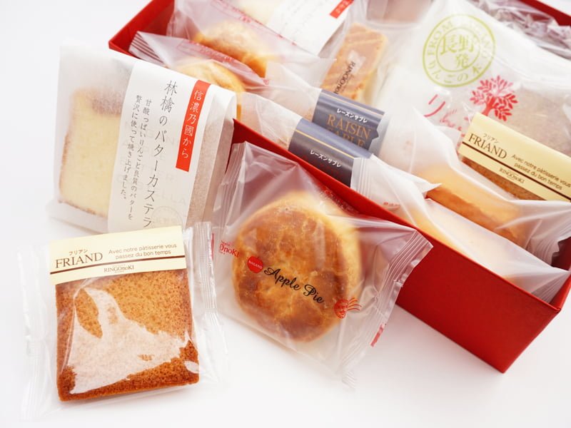 長野アップルパイ・りんごサブレが各3個、林檎のバターカステラ・エンガディナー・フリアン・レーズンサブレ・りんごの樹が各2個ずつ入っています。