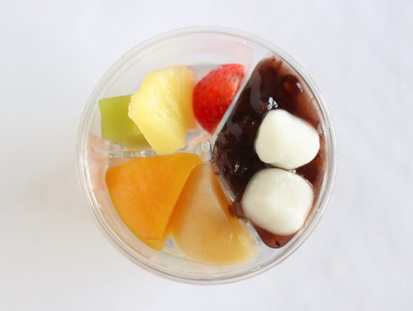 上段の容器には、白桃・黄桃・パイナップル・苺・小豆・白玉・水羊かんが乗っています。