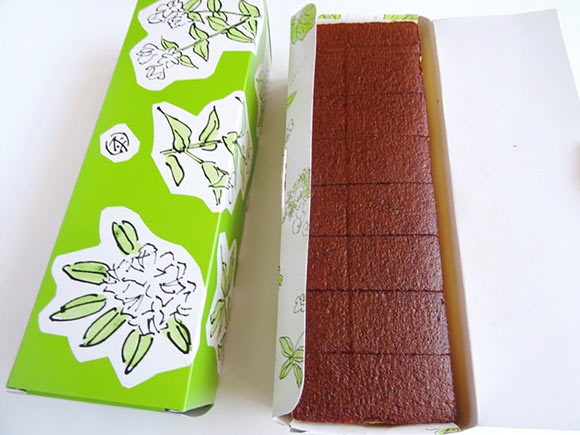 カステラの箱は、黄緑色で可憐な白い花が描かれています。
