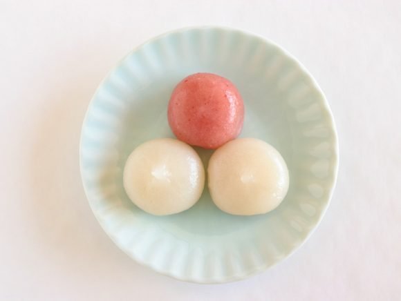 白は黄金の梅ジャム入り、紅は梅果肉入りの新粉餅です。