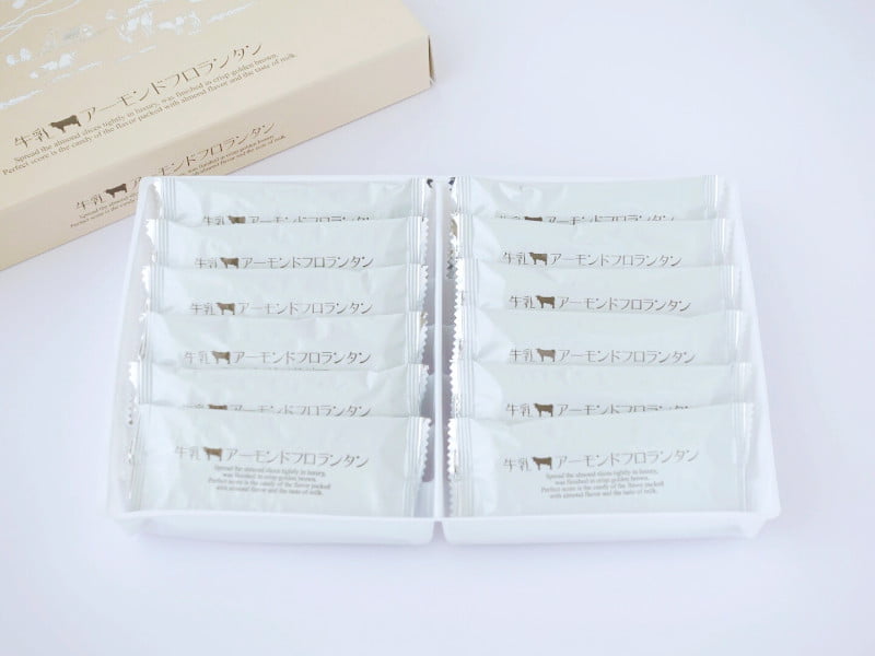 今回紹介する「六甲山 牛乳アーモンドフロランタン」は、クッキー生地の代わりに最中を使用していることで、軽い歯ざわりが特徴的なお菓子となっています。