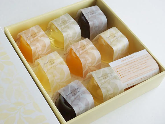 すべて国産の果実にこだわったゼリーで、満足感も十分。夏場につめたく冷やして食べたいおみやげです。