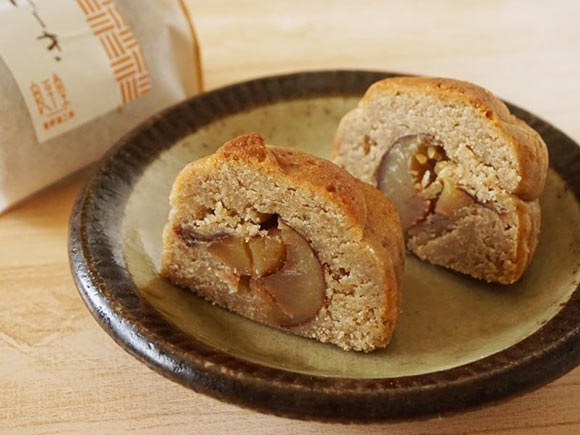 良平堂の渋栗けーきは、恵那栗をごろっと生地に入れて焼き上げたお菓子。