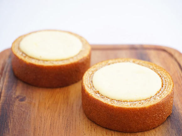バウムクーヘンの中にチーズケーキが入っていて、インパクトのある見た目をしていますよ。