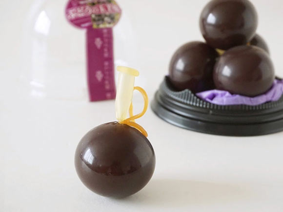 ゴムでできた風船に詰めた羊羹で、爪楊枝で刺すとつるりと皮がむけるという仕組みです。