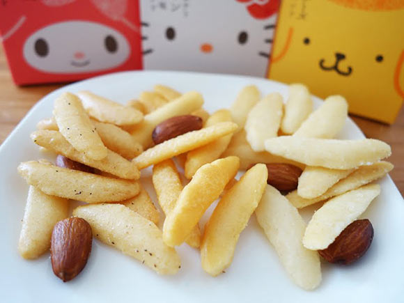 ハローキティには「かきたねポテト プレーンソルト」、ポムポムプリンには「贅沢チーズ」、マイメロディには「海鮮風塩だれ」が入っていますよ。
