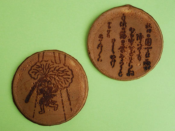 お菓子は直径9cmほどと大きめで、1袋に2枚入り。それぞれフキ&童子のイラスト、秋田音頭の一節が焼印で描かれています。