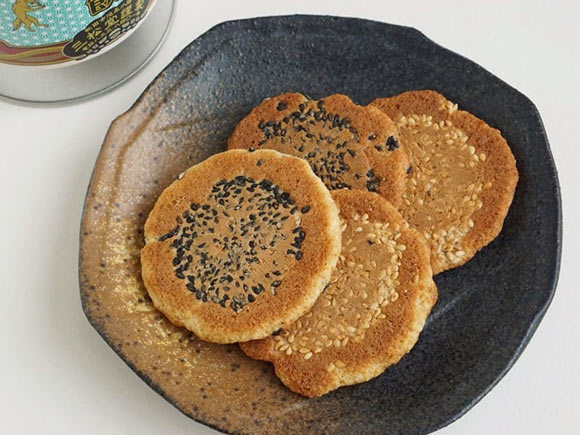 レトロ菓子シリーズのひとつ、胡麻煎餅は、両面に白ごま・黒ごまをたっぷりとまぶして焼き上げたせんべい。