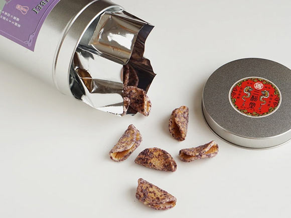 「大正昭和レトロ菓子」シリーズのひとつ、しそせんべいは、ひと口サイズの煎餅に、たっぷりのしその葉をからませたもの。