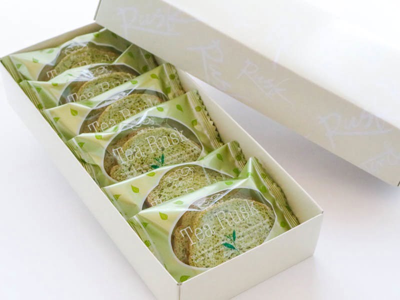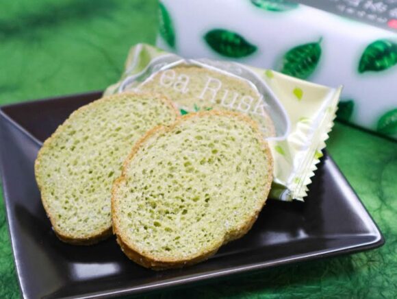 さやま茶らすくは、生地に狭山茶の抹茶を練り込んだシュガーラスク。