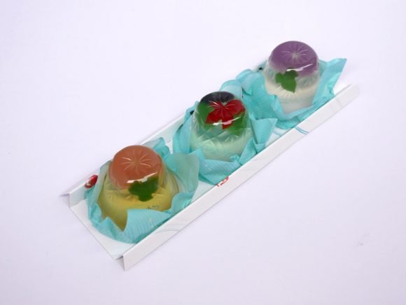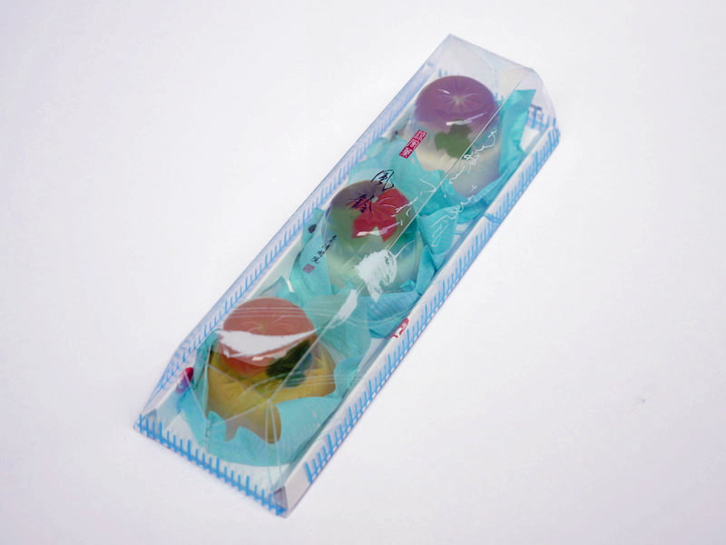 金魚、朝顔 紫、朝顔 ピンクの3種類の詰合せで、カラフルな模様は羊羹で作られています。