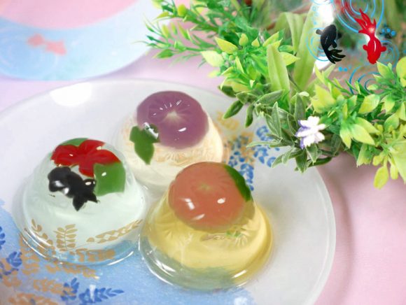 ゼリーの中には羊羹でつくられた金魚や朝顔が浮き、その名のとおり風鈴のように見えますね。