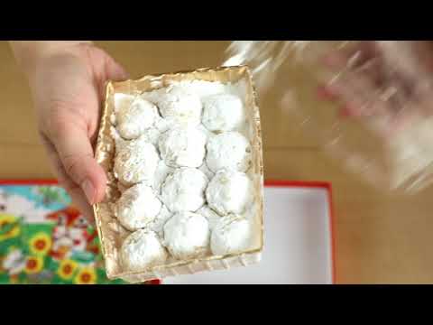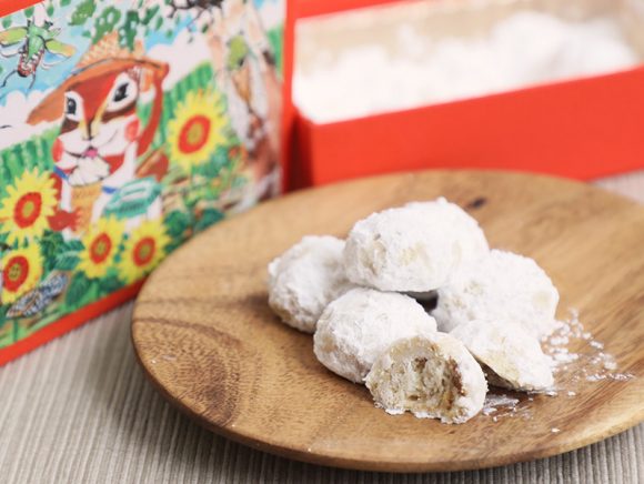 箱を開けると、クッキーの形が見えないほど、たくさんの粉砂糖がまぶされいるのが特徴的。