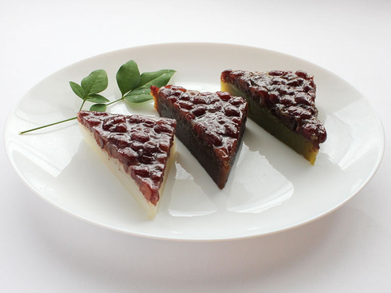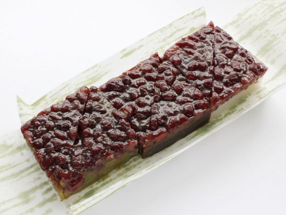 外郎(ういろう)に甘く煮た小豆をのせ、三角の形に切っています。