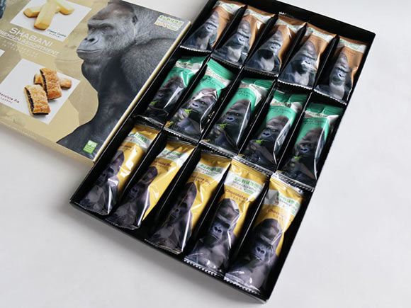愛知県名古屋市・千種区にある観光スポット「東山動植物園」のイケメンゴリラ「シャバー二」がパッケージになったお菓子セット。3種類のスティックタイプのスイーツが楽しめます。