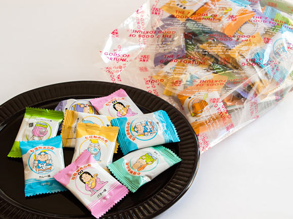 えび味(恵比寿天)、青のり味(大黒天)、しそ味(福禄寿)、バター味(弁財天)、唐辛子味(寿老人)、チーズ味(布袋尊)、カレー味(毘沙門天)と、7つの味それぞれの袋に七福神のイラストが描かれています。