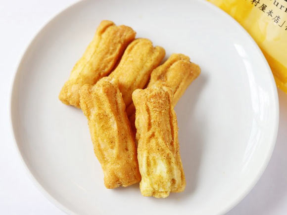 1袋長さ5.5センチほどの指先でつまめるサイズのカリーあられが5本入っています。湿気が大敵のあられですから、食べきりサイズの小袋包装は便利ですね。